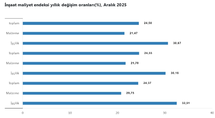 TÜİK verilerine göre, Aralık 2025’te inşaat maliyet endeksi yıllık yüzde 24,5 artışla yükseldi. Malzeme ve işçilik maliyetlerindeki artış, özellikle işçilik payının yüksek olduğu bina inşaatlarında dikkat çekti. Veriler, hem malzeme, hem de işçilik maliyetlerinin yıllık bazda yüksek artış gösterdiğini ortaya koydu.