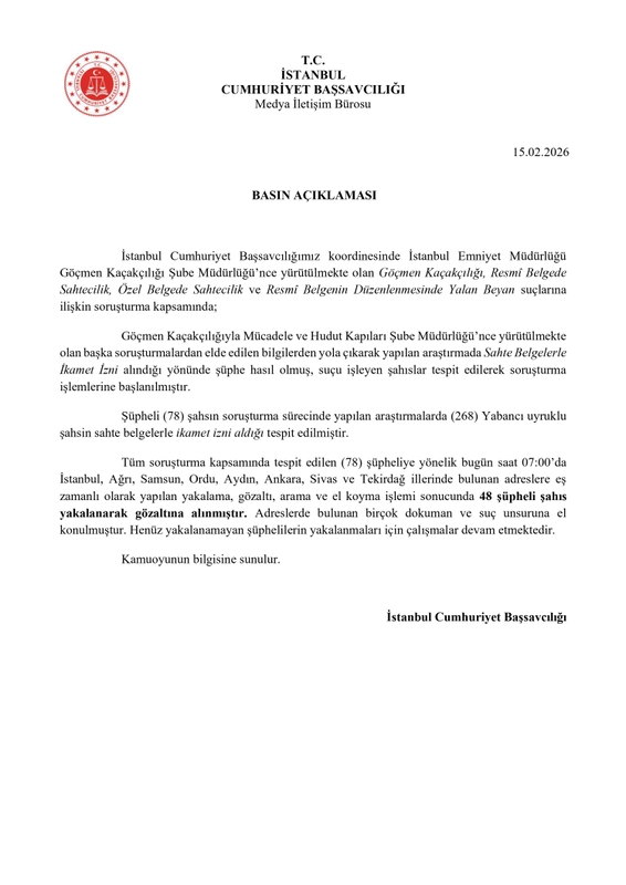 Yürütülen çalışmalar sonucunda 78 şüpheli şahsın organizasyon içerisinde yer aldığı, ayrıca 268 yabancı uyruklu kişinin sahte belgelerle ikamet izni aldığı belirlendi.