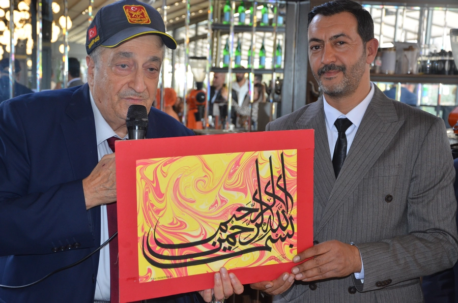 Ud, resim, hat, ebru, kaligraf, ahşap dağlama dallarında birçok eseri olan Muharip Gazi Fikri Demirbaş “her hayrın başı Bismillahirrahmanirrahim gönlü yüce Başkanımız İzzet Kaya ve ailesine huzur dileklerimle” diyerek bir hediye takdiminde bulundu.
