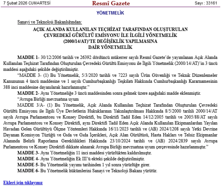 Sanayi ve Teknoloji Bakanlığı, “Açık Alanda Kullanılan Teçhizat Tarafından Oluşturulan Çevredeki Gürültü Emisyonu ile İlgili Yönetmelik”te AB mevzuatına uyum ve bazı maddelerde değişiklikler yaptı.