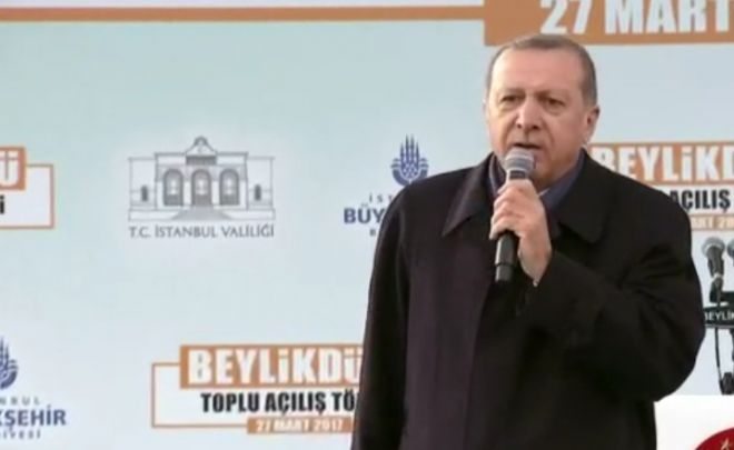 Cumhurbaşkanı idam konusuna da değinerek şunları söyledi "15 Temmuz Şehitler Köprüsü yapılırken `hayır dediler. Fatih Sultan Mehmet Köprüsü yapılırken `hayır` dediler. Yavuz Sultan Selim Köprüsü yapılırken, Osmangazi Köprüsü yapılırken `hayır` dediler. Marmaray, 3 yılda 200 milyon insan geçti, Marmaray yapılırken `hayır`. Avrasya Tüneli`ne ne dediler: Hayır... Hayır... Hayır... Şimdi yeni bir versiyon çıktı. Kandil`den talimat geliyor: Hayır deyin. İmralı`dan talimat geliyor: Hayır deyin. Pensilvanya`dan haber geliyor, FETÖ`den hayır diyor... 16 Nisan`ı halledelim bu idam konusu parlamentoya gelecek ve parlamentodan geçtiği anda bana geldiği anda ben bunu onaylarım. Çünkü 249 şehidin katillerini devletin affetme yetkisi yoktur. Parlamentodan geçtiği anda onaylarım."