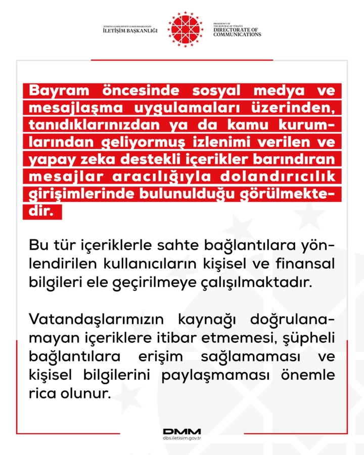 İletişim Başkanlığı bünyesindeki Dezenformasyonla Mücadele Merkezi (DMM), yaklaşan bayram öncesinde artış gösteren yapay zekâ destekli dolandırıcılık yöntemlerine karşı vatandaşları acil koduyla uyardı.