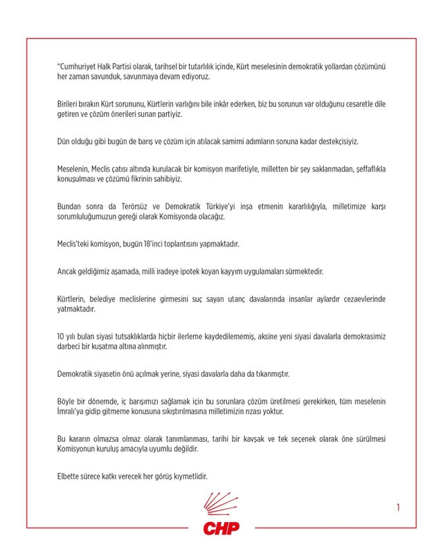 CHP, meselenin şeffaf biçimde Meclis çatısı altında ele alınması gerektiğini vurguladığ azılı açıklamada, "Partimiz bu ülkeye barışı da demokrasi ve adaleti de getirecek iradeye sahiptir!” denildi.