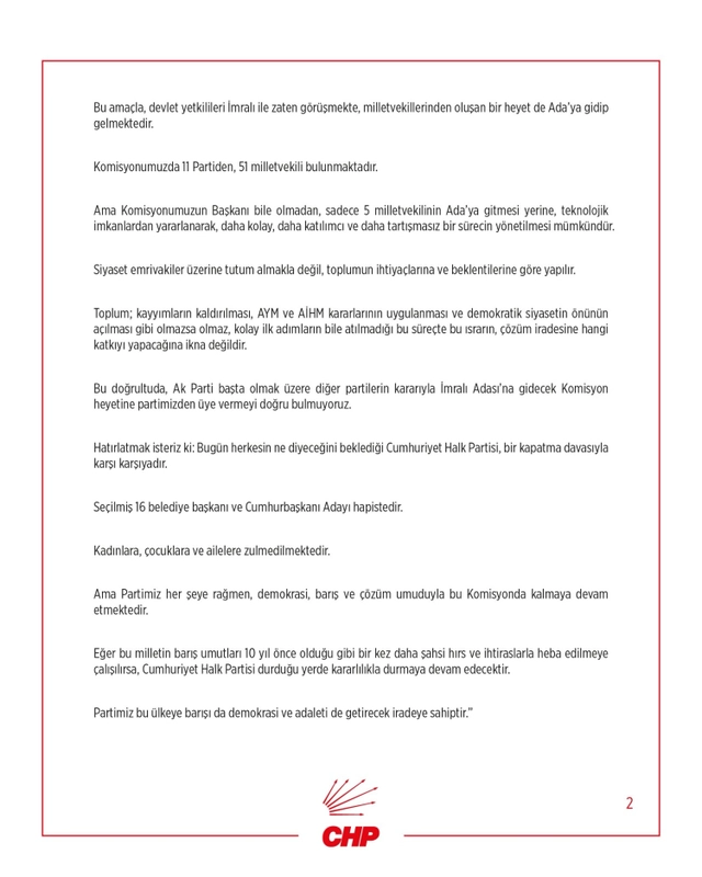 CHP, toplumun beklentisinin bu sorunların çözümü olduğunu belirterek, “Tüm mesele İmralı’ya gidip gitmeme tartışmasına sıkıştırılmak isteniyor. Bu kararın olmazsa olmaz olarak sunulmasına milletimizin rızası yoktur.” dedi. Yazılı açıklamada, yalnızca birkaç milletvekilinin İmralı’ya gönderilmesi yerine daha katılımcı ve teknolojik yöntemlerle sürecin yürütülebileceğini savundu.