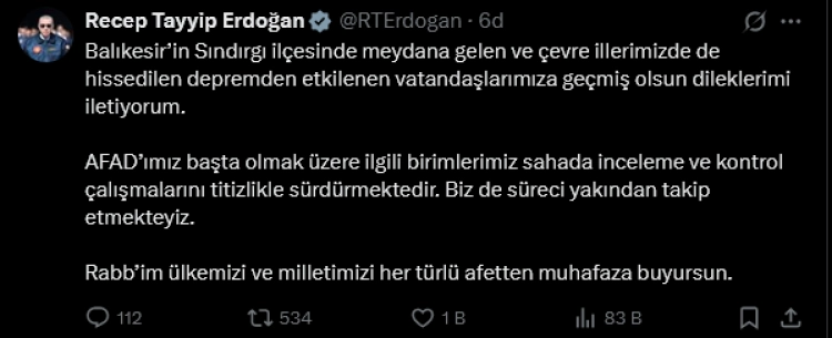 Balıkesir’in Sındırgı ilçesinde meydana gelen ve çevre illerimizde de hissedilen depremden etkilenen vatandaşlara 'geçmiş olsun' dileklerini ileten Cumhurbakanı Erdoğan, "AFAD’ımız başta olmak üzere ilgili birimlerimiz sahada inceleme ve kontrol çalışmalarını titizlikle sürdürmektedir. Biz de süreci yakından takip etmekteyiz. Rabb’im ülkemizi ve milletimizi her türlü afetten muhafaza buyursun.” ifadelerini kullandı.