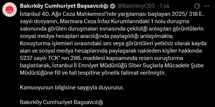 Yetkisiz kişiler tarafından kaydedilen ve sosyal medyada yayınlanan içeriklerle ilgili olarak re'sen soruşturma başlatıldığı ve İstanbul İl Emniyet Müdürlüğü Siber Suçlarla Mücadele Şube Müdürlüğü’ne fiil ve fail tespitine yönelik talimat verildiği ifade edildi. Açıklamada duruşma ve kovuşturma süreçlerinde gizlilik ve güvenliğin önemine dikkat çekildi.