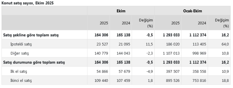 Yılın ilk 10 ayında (Ocak–Ekim) konut satışları, geçen yılın aynı dönemine göre yüzde 16,2 artarak 1 milyon 293 bin 33’e ulaştı.