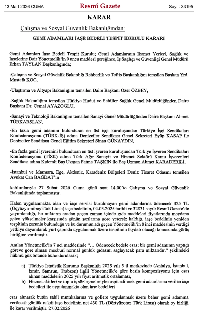 Yapılan değerlendirmelerde Türkiye İstatistik Kurumu’nun 2025 yılı için Antalya, İstanbul, İzmir, Samsun ve Trabzon illerinde belirlediği gıda fiyat ortalamaları ile gemi adamlarına hizmet akitleri ve toplu iş sözleşmeleri kapsamında ödenen iaşe bedelleri dikkate alınırkn, bu kapsamda iaşe servisi kurulmamış gemilerde çalışan gemi adamlarına ödenecek günlük nakdî iaşe bedeli net 430 TL olarak belirlendi.
