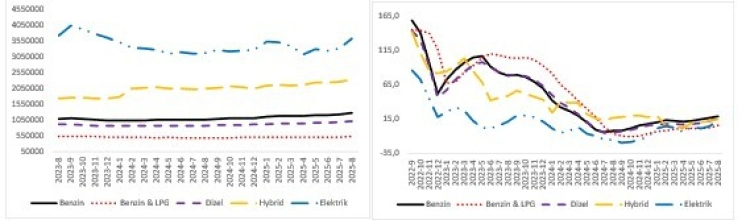 Yapılan araştırmaya göre hazırlanan "Otomobil Piyasası Görünümü" raporunda, Ağustos ayında otomobil talep endeksi geçen yıla göre yüzde 11,4 yükseldi. Reel fiyatlardaki düşüş yüzde 11,1'e gerilerken, elektrikli araçlar 3,6 milyon TL ortalamayla en pahalı yakıt türü oldu.