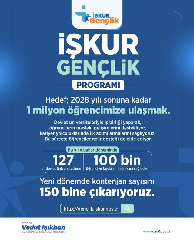 Çalışma ve Sosyal Güvenlik Bakanı Vedat Işıkhan, İŞKUR Gençlik Programı’nda kontenjanın 150 bin’e yükseltildiğini duyurdu. Cumhurbaşkanı Erdoğan’ın Kabine Toplantısı sonrası açıkladığı müjdeyle, 2028 sonuna kadar 1 milyon öğrenciye ulaşma hedefi belirlendi. Bahar döneminde 100 bin öğrenci kampüslerde deneyim ve gelir desteği aldı.