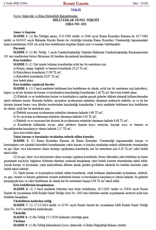 ANKARA (İGFA) - Çevre, Şehircilik ve İklim Değişikliği Bakanlığı, 2026 yılı kamu konutu kira bedellerini düzenleyen Milli Emlak Genel Tebliği’ni bugünkü Resmi Gazete’de yayımladı.