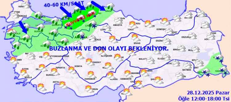 Yağışların; Batı Karadeniz (Sinop hariç), Doğu Anadolu’nun güneydoğusu ile Rize, Ağrı, Iğdır, Muş, Batman, Mardin, Siirt çevreleri ve Artvin kıyılarında kuvvetli yağış ve yoğun kar şeklinde olması beklenirken, hava sıcaklıklarının ülke genelinde mevsim normallerinin altına düşeceği, kuzey, iç ve doğu kesimlerde buzlanma ve don, İç Anadolu’da ise pus ve yer yer sis görüleceği tahmin edildi.