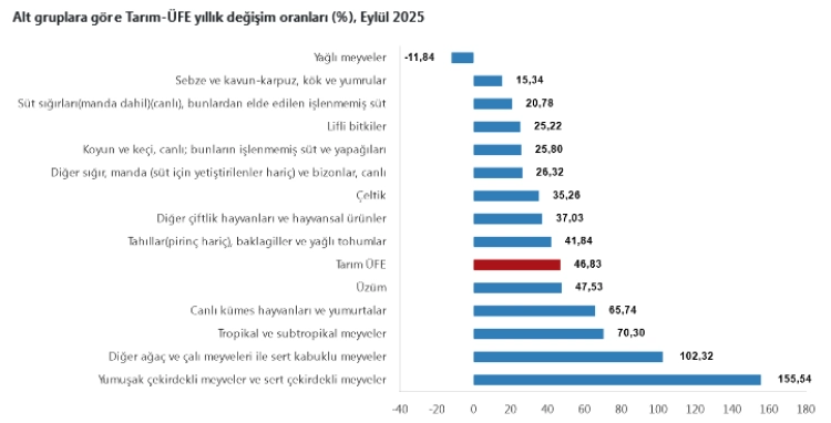 Eylül ayında Tarım-ÜFE endeksi bir önceki yılın aynı ayına göre yüzde 46,83, bir önceki aya göre yüzde 5,80 artış gösterdi. Yıllık en yüksek artış yüzde 155,54 ile yumuşak ve sert çekirdekli meyvelerde, aylık en yüksek artış yüzde 19,63 ile diğer ağaç ve çalı meyveleri ile sert kabuklu meyvelerde kaydedildi.