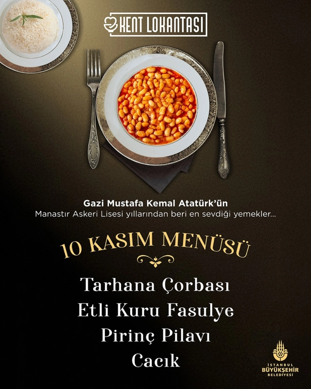 İstanbul’un dört bir yanındaki Kent Lokantaları, geleneksel hale gelen 10 Kasım menüsüyle vatandaşları ağırlayacak. Atatürk’ün en sevdiği yemeklerden oluşan “kuru fasulye, pilav ve hoşaf” menüsü, bu yıl da tüm Kent Lokantalarında ikram edilecek.