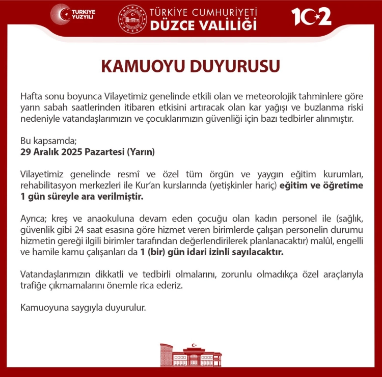 Düzce Valiliği, tatil kararını sosyal medya hesabından duyururken, Vali Selçuk Aslan, paylaşımında, karın keyfini çıkaran öğrencilere sağlıklarını korumaları ve kitaplarla vakit geçirmeleri tavsiyesinde bulundu.
