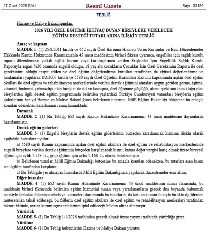 Hazine ve Maliye Bakanlığı tarafından hazırlanan tebliğle, özel eğitime ihtiyaç duyan bireyler için 2026 yılında verilecek devlet destek tutarları Resmî Gazete’de yayımlandı.