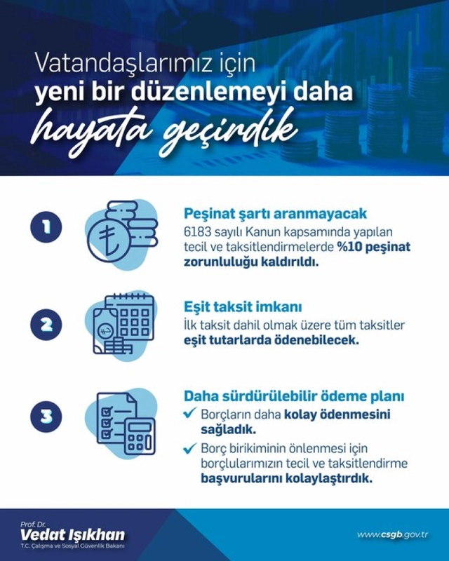 ANKARA (İGFA) - Çalışma ve Sosyal Güvenlik Bakanı Prof. Dr. Vedat Işıkhan'ın paylaşımına göre, SGK prim borçlarında tecil ve taksitlendirme işlemlerinde artık yüzde 10 peşinat şartı uygulanmayacak.