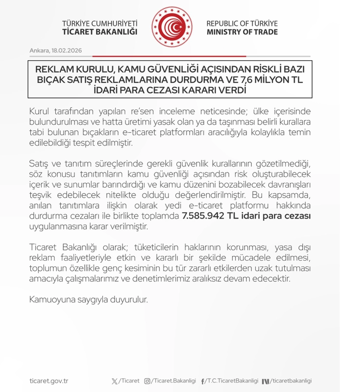 Yapılan resen incelemelerde; ülkede bulundurulması ya da üretimi yasak olan veya taşınması belirli kurallara tabi bulunan bazı bıçakların e-ticaret platformları üzerinden kolaylıkla temin edilebildiği tespit edildi. Tanıtım ve satış süreçlerinde gerekli güvenlik önlemlerinin gözetilmediği, kamu güvenliği açısından risk oluşturabilecek içeriklerin yer aldığı değerlendirildi. Bu kapsamda, mevzuata aykırı tanıtım yaptığı belirlenen 7 e-ticaret platformuna durdurma cezası verilmesiyle birlikte toplam 7 milyon 585 bin 942 TL idari para cezası uygulanmasına hükmedildi.
