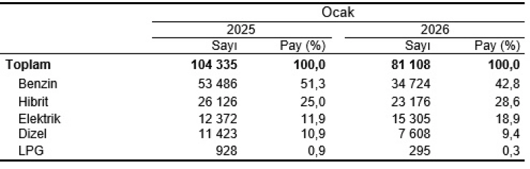 Yeni kaydedilen otomobillerin yüzde 42,8’i benzinli, yüzde 28,6’sı hibrit ve yüzde 18,9’u elektrikli oldu. Dizel otomobillerin payı yüzde 9,4’te kaldı. Mevcut otomobil parkında ise dizel (yüzde 32,5), benzin (yüzde 31) ve LPG’li (yüzde 30) araçlar ağırlığını koruyor; elektrikli otomobillerin toplam payı yüzde 2,2 seviyesinde bulunuyor.
