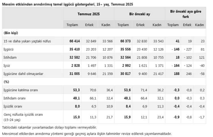 İstihdam ve İşgücü Verileriİstihdam edilenlerin sayısı Temmuz 2025’te 18 bin kişi artarak 32 milyon 582 bin kişiye ulaştı, ancak istihdam oranı yüzde 49,1’de sabit kaldı.