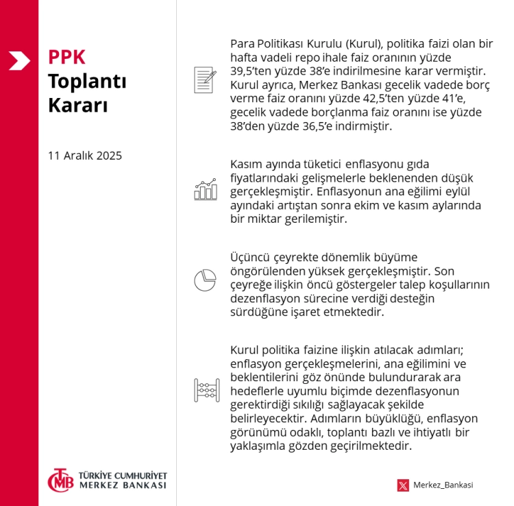 Merkez Bankası Para Politikası Kurulu yılın son faiz kararını açıkladı. 1 hafta vadeli repo ihale faiz oranı 150 baz puan indirildi. Politika faizi, yüzde 39,5 seviyesine yüzde 38'e indirirken, gecelik vadede borçlanma faiz oranını ise yüzde 38’den yüzde 36,5’e indirildi.