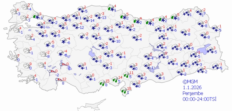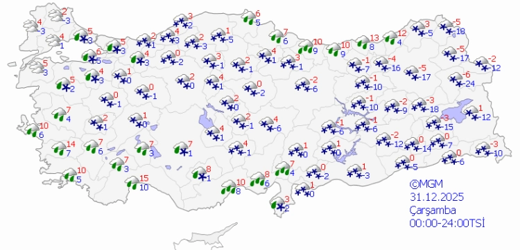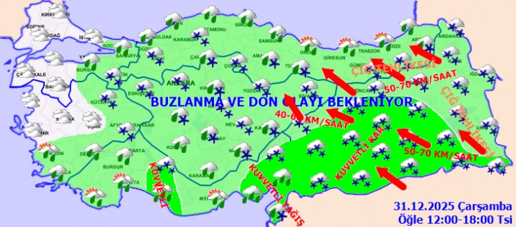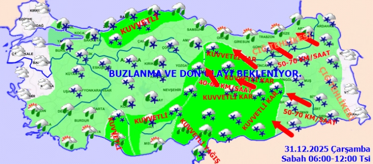 Meteoroloji Genel Müdürlüğü, 2025’in son günü ve yeni yılın ilk gününde Türkiye genelinde soğuk ve yağışlı havanın etkili olacağını duyurdu. Yurt genelinde soğuyan hava ile birlikte kuvvetli yağış, fırtına, buzlanma ve çığ tehlikesine dikkat!