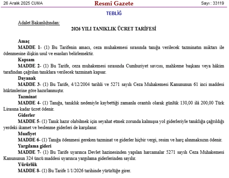 Bu arada yine bugünkü Resmi Gazete'de Adalet Bakanlığ'nca yayımlanan Tanıklık Ücret Tarifesi de netleşti.