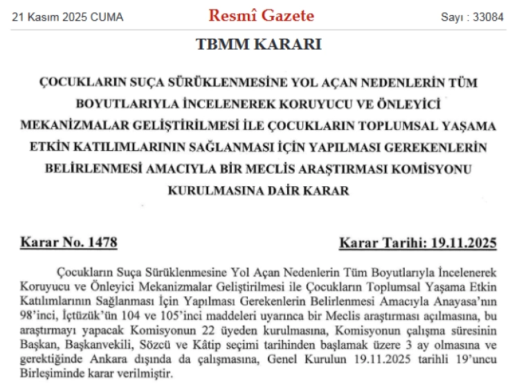 Resmi Gazete'de yayımlanan TBMM kararıyla, çocukların suça sürüklenmesine yol açan nedenlerin incelenmesi ve koruyucu mekanizmaların geliştirilmesi amacıyla 22 üyeli bir Meclis Araştırma Komisyonu kuruldu. Komisyonun çalışma süresi 3 ay, TÜİK verilerine göre 2024'te 202 bin çocuk suça sürüklenmişti.