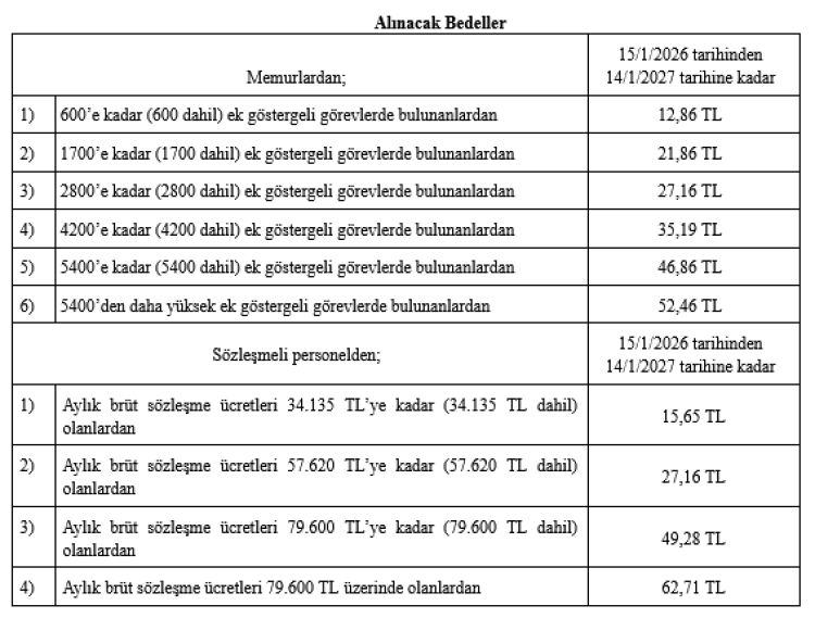 Memurlar için günlük asgari yemek bedelleri, ek göstergeye göre 12,86 TL ile 52,46 TL arasında değişirken; sözleşmeli personel için günlük yemek bedeli, brüt sözleşme ücretine göre 15,65 TL’den başlayıp 62,71 TL’ye kadar yükseliyor.