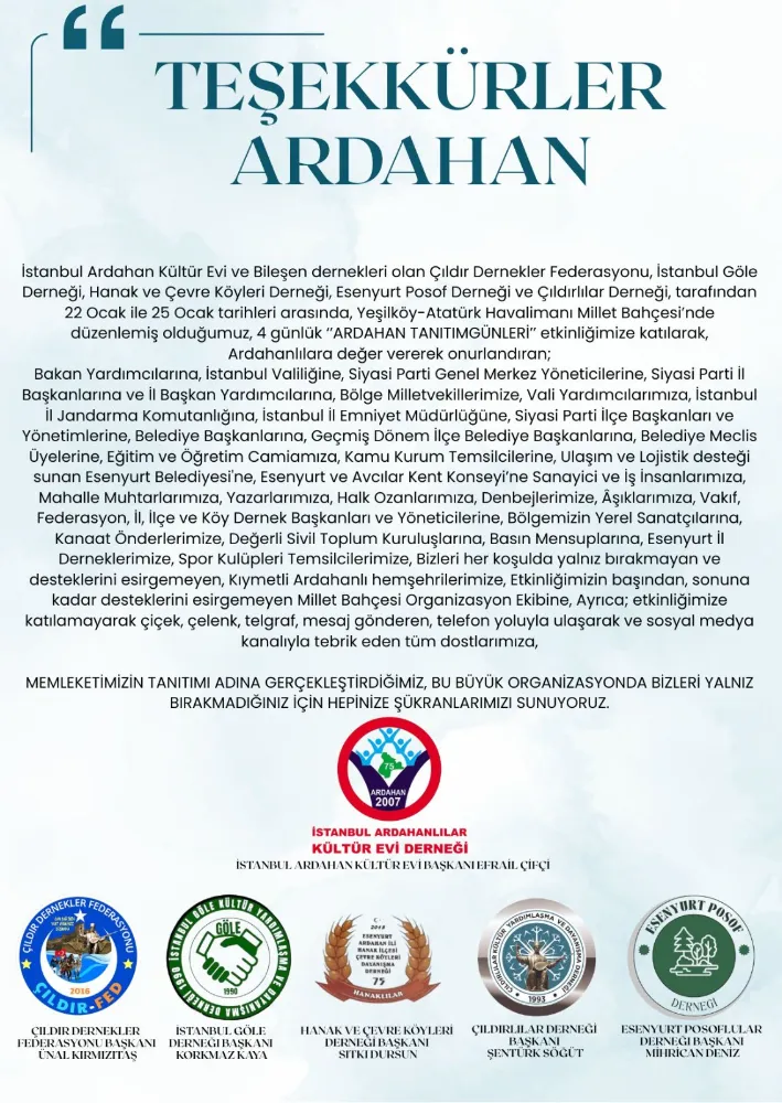 İstanbul Ardahanlılar Kültür Evi ve bileşen dernekler adına ortaklaşa olarak yayımlanan Teşekkür Mesajında şu ifadeler yer aldı;