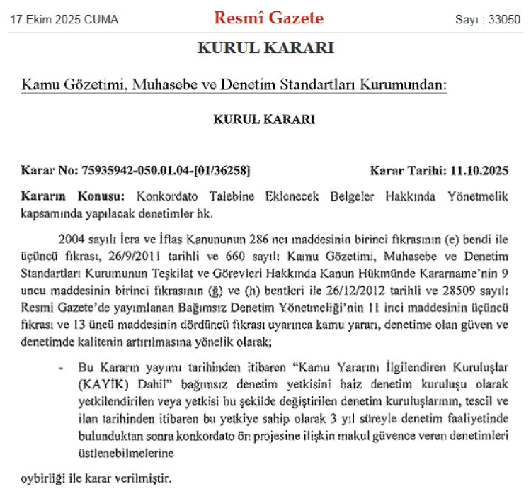 Karara göre, denetim kuruluşları yalnızca 3 yıllık deneyim sonrasında konkordato ön projesine ilişkin makul güvence verebilecek; bu süreyi tamamlamamış firmalar bu alanda görev alamayacağı belirtildi.
