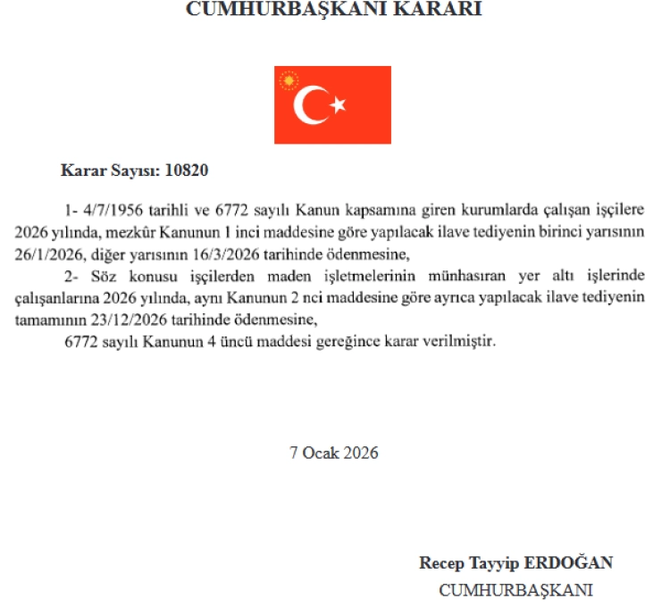 Cumhurbaşkanı Recep Tayyip Erdoğan’ın imzasıyla yayımlanan Resmi Gazete kararına göre, kamuda çalışan işçilerin 2026 yılı ilave tediye ödeme tarihleri açıklandı.