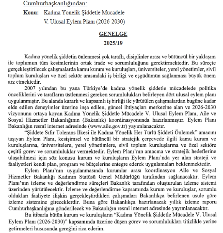 ANKARA (İGFA) - Cumhurbaşkanı Recep Tayyip Erdoğan’ın imzasıyla “Kadına Yönelik Şiddetle Mücadele V. Ulusal Eylem Planı (2026-2030)”na ilişkin 2025/19 sayılı Genelge, bugünkü Resmi Gazete’de yayımlanarak yürürlüğe girdi.