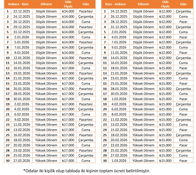 8 Yataklı Vagon + 1 Yemekli Vagon ile her yataklı vagonda 10 kompartımanda 2'şer adet tek kişilik yataktan toplam 160 kişi yolcu kapasiteli trenlerin sefer günleri ve oda ücret tarifesi şöyle: