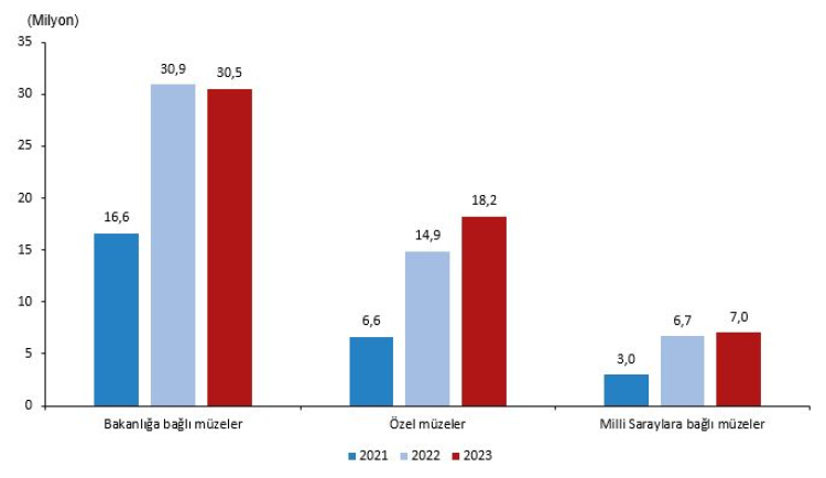 Müze ve ören yeri ziyaretçi sayısı, 2023 yılında yüzde 6,2 artarak 55 milyon 752 bin 208 oldu. Ziyaretçilerin yüzde 54,7'si Bakanlığa bağlı müze ve ören yerlerini ziyaret etti. Bakanlığa bağlı ücretli müze ve ören yerlerini ziyaret edenlerin sayısı 17 milyon 673 bin 661 ve toplam ziyaretçiler içindeki payı yüzde 31,7 oldu. Özel müze ziyaretçi sayısı yüzde 22,5 artarak 18 milyon 236 bin 130 olurken Milli Saraylar Başkanlığına bağlı müze ziyaretçi sayısı yüzde 5,0 artarak 7 milyon 27 bin 103 oldu.